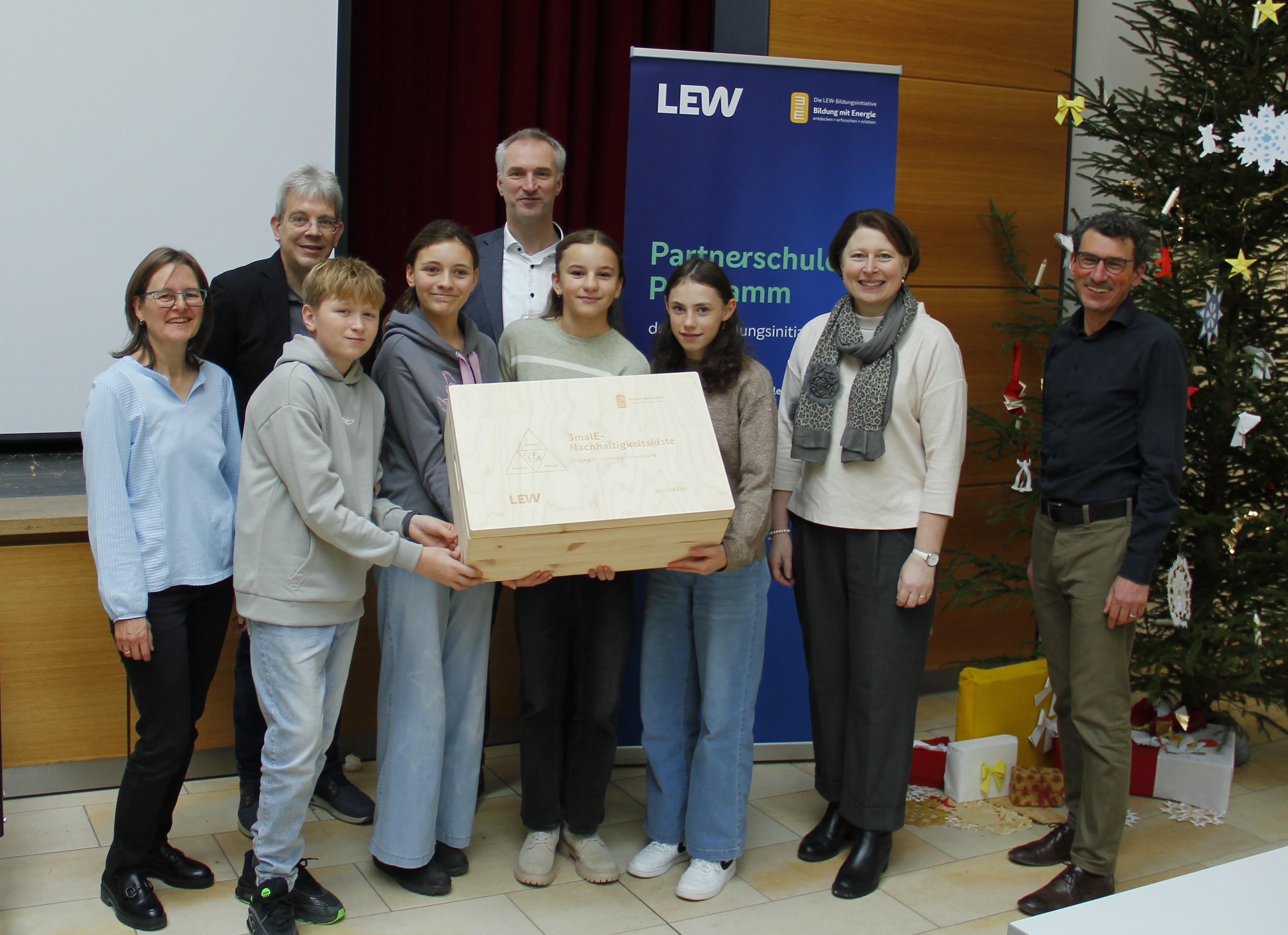 Über ein verfrühtes Weihnachtsgeschenk konnte sich das Gymnasium Donauwörth freuen, der Überbringer war Walter Albrecht, Leiter des Kommunalmanagements bei LEW. Er übergab den Gewinn aus dem Partnerschulen-Programm, eine Nachhaltigkeitskiste, an die Schulleitung und einige Klimabotschafter aus der 7. Klasse. Auch der Klimamanager der Stadt, Herr Stefan Rösch, und eine Vertreterin des Landkreises, Frau Claudia Marb, waren bei der Übergabe dabei. Das Gymnasium Donauwörth nimmt seit mehreren Jahren am Partnerschulen-Programm von 3malE teil und hatte sich heuer für die Nachhaltigkeitskiste beworben und per Los erfreulicherweise den Zuschlag erhalten.